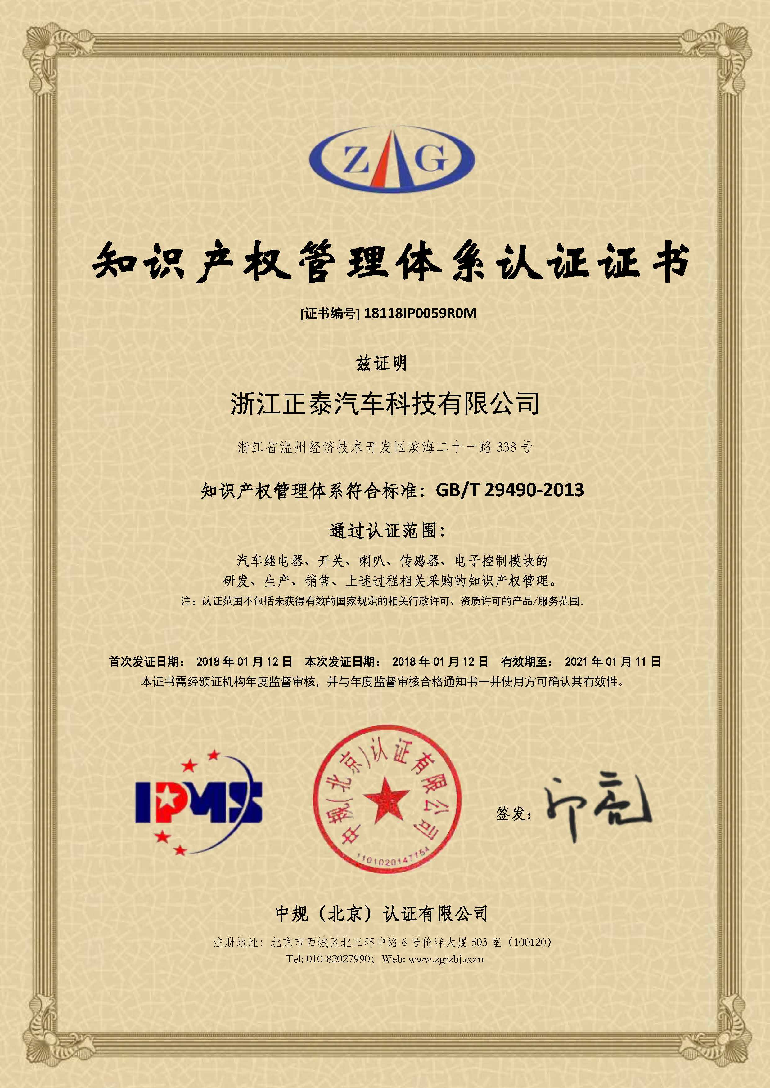 知識產(chǎn)權(quán)管理體系認證證書